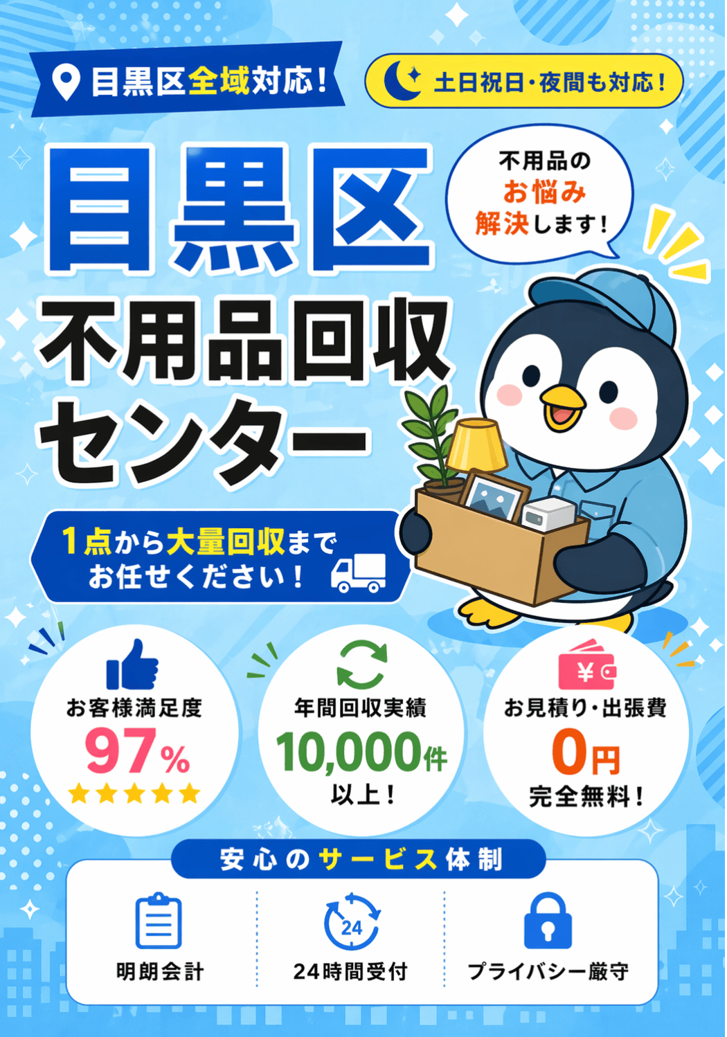数ある事業者の中から目黒区不用品回収センターをお選びいただき、誠にありがとうございます。